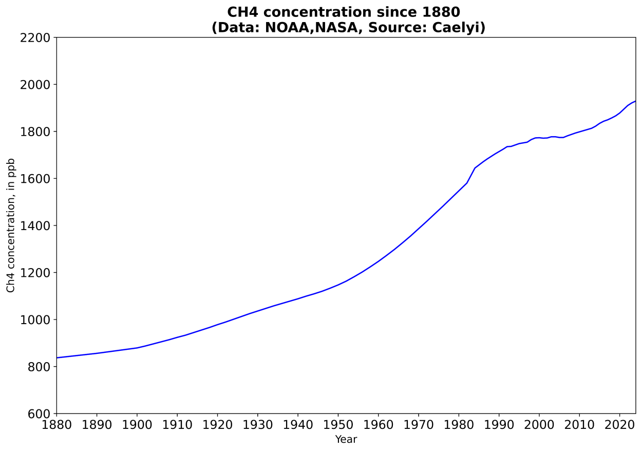 Since 1880, methane concentration has risen from 837 ppb to 1929 ppb. That increase is directly due to the growth of human activities, which account for 60% of global methane emissions (fossil fuel use, agriculture, etc.).